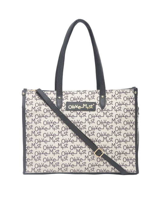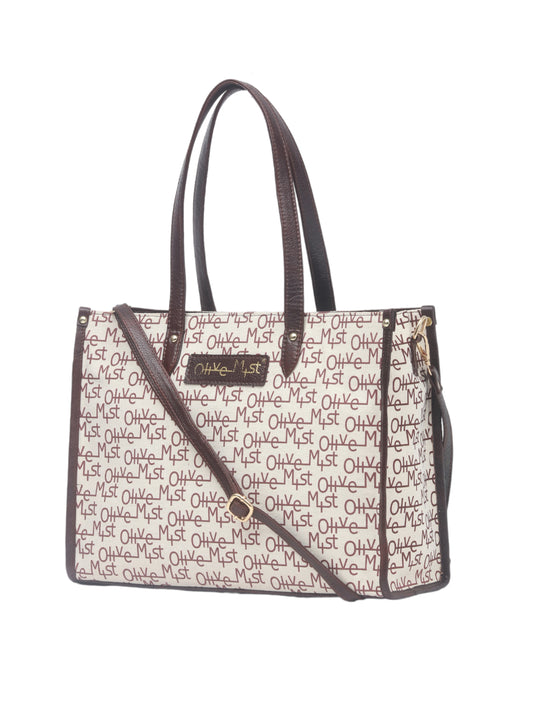 Women Leather & Fabric Typographic Printed 16 Inch Laptop Bag (OMLBW-001F-CBROWN)
